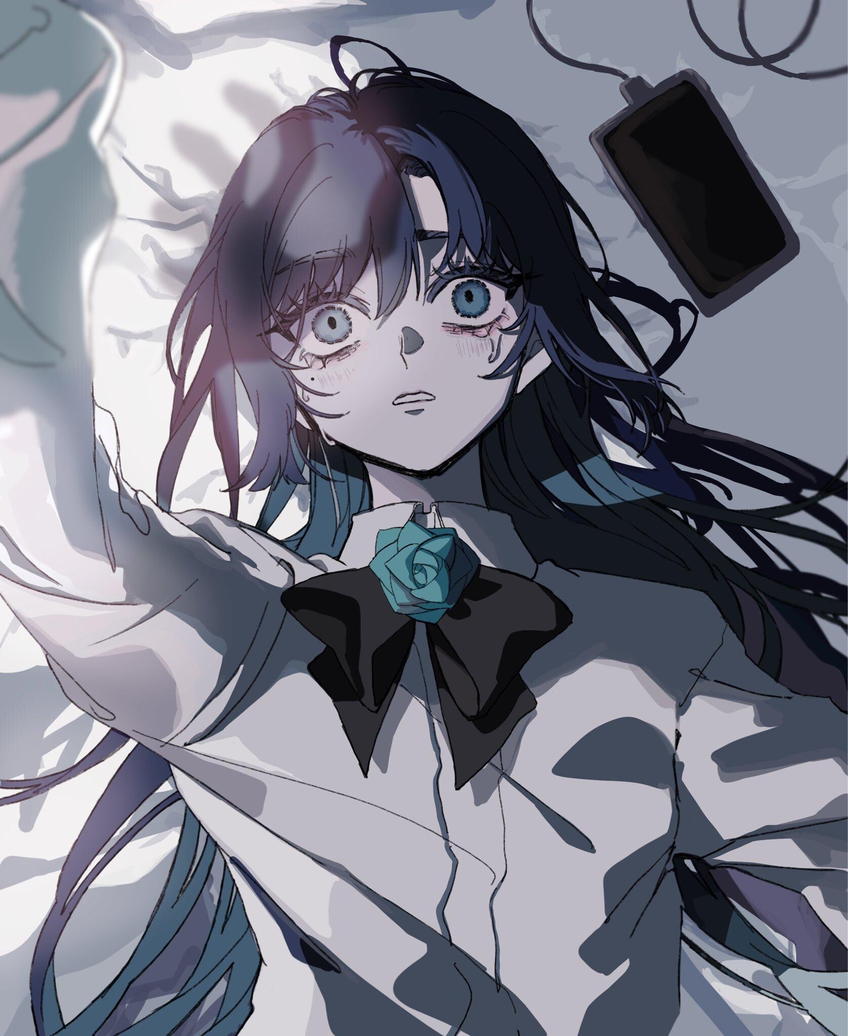 The character’s design combines bold, clean lines with carefully placed shadows and highlights, giving the figure both depth and a dynamic presence. The use of dark tones in the clothing contrasts beautifully with the bright blue accents—like the ribbon and rose—adding visual interest and a sense of elegance.